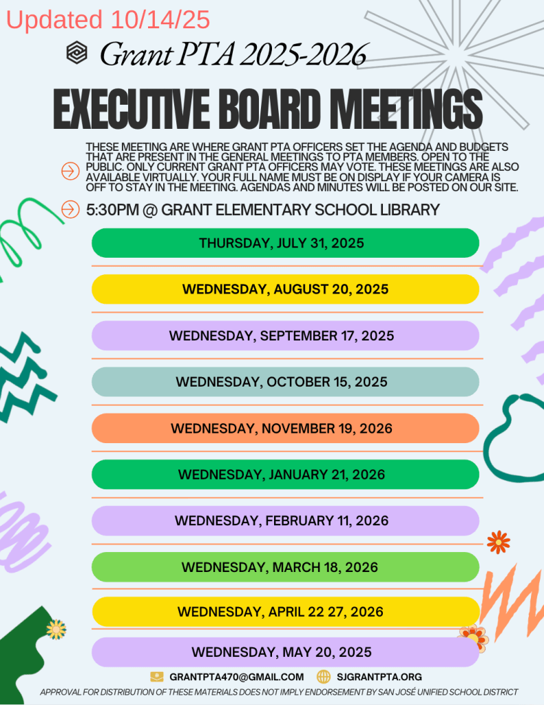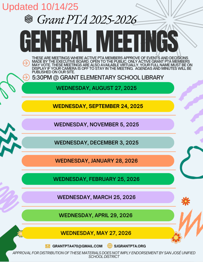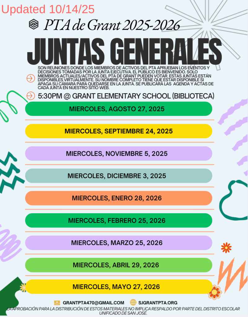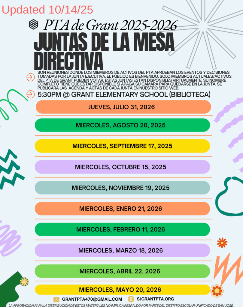 Agendas and Minutes will become linked once posted. You can also view these and other relevant Grant PTA documents in this Google folder. The flyers with all the dates are at the bottom of this page/ Las agendas y actas se vincularán una vez publicadas. También puedes consultarlas y otros documentos de Grant PTA en esta carpeta de Google. Los volantes con las juntas del año están al final de ésta página (abajo).